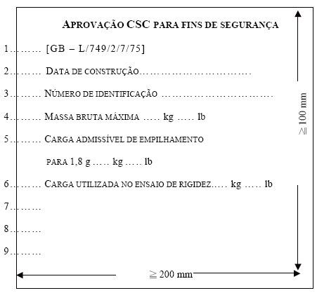 Segundo a Convenção Internacional para Segurança de Contêineres (CSC), assinada em Genebra, em 2 de dezembro de 1972, ainda é necessária uma placa retangular fixada de modo permanente, resistente à corrosão e ao fogo, com medidas de pelo menos 200x100 mm.